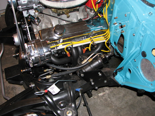 power steering pump mounted, steering box mounted, distributor and wires installed,