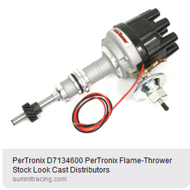 A smaller Pertronix “stock look distributor” was used to get better clearance to carbs. The previous distributor was a Pertronix billet unit with Ignitor II module. As an upgrade, the new distributor has the Ignitor III dual spark module with internal rev limiter and uses a higher current coil. Now going with stock look black color cap and Pertronix 7MM “Stock Look” black plug wires. In addition, the Pertronix distributor gear was replaced with a Melonized gear from COMP Cams(as seen below), Without question, this gear is compatible with Comp Cams hydraulic roller camshafts material. Gear installation followed the very good on-line instructions found at https://www.craigscobras.com/tips/distgear/