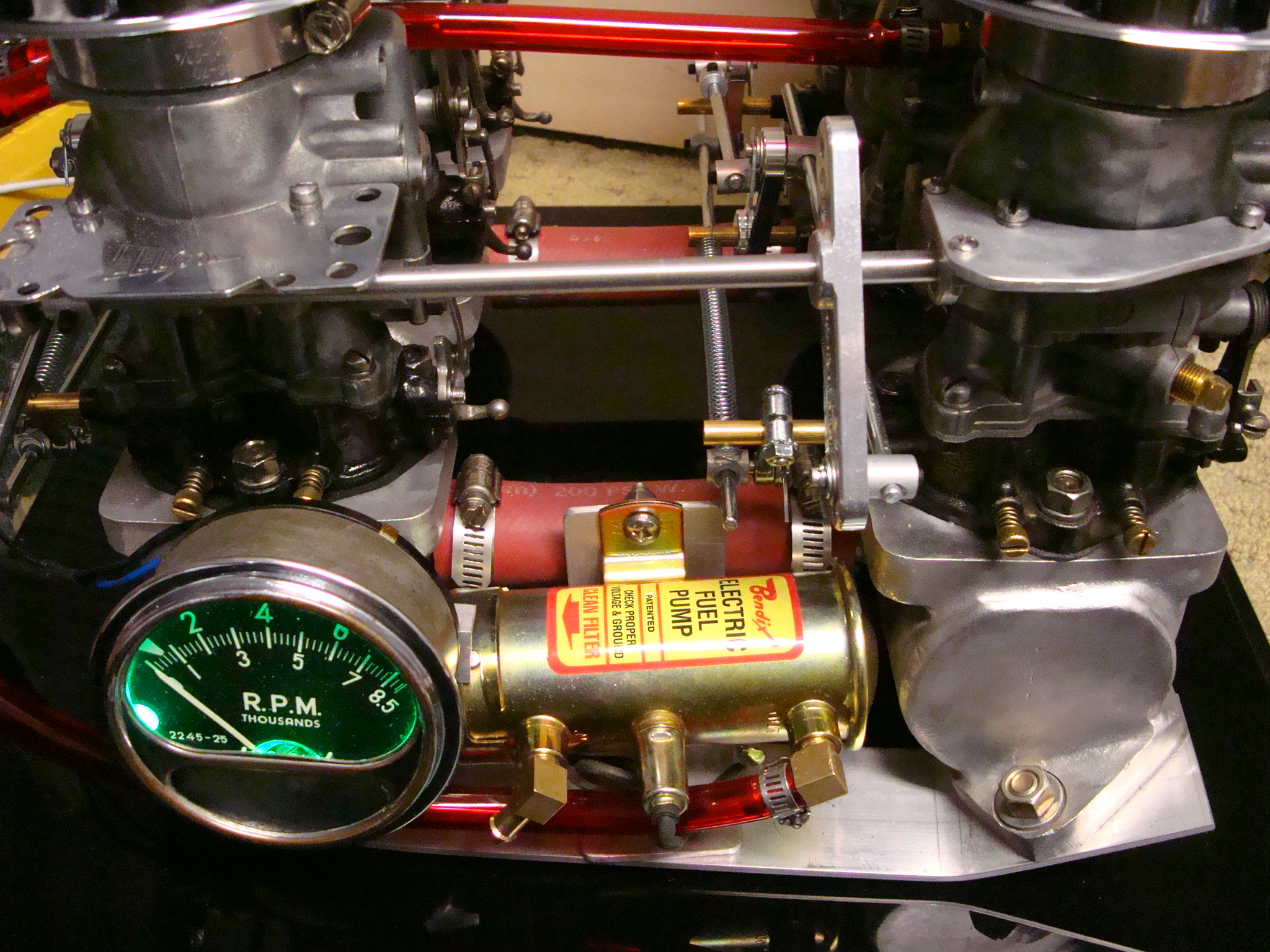 Closeup view of the Bendix electric fuel pump and lit Sun tachometer.