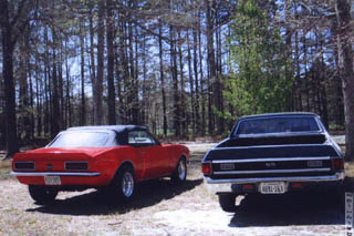These muscle cars are Bill Riley's personal cars. His 67 red camaro is restored